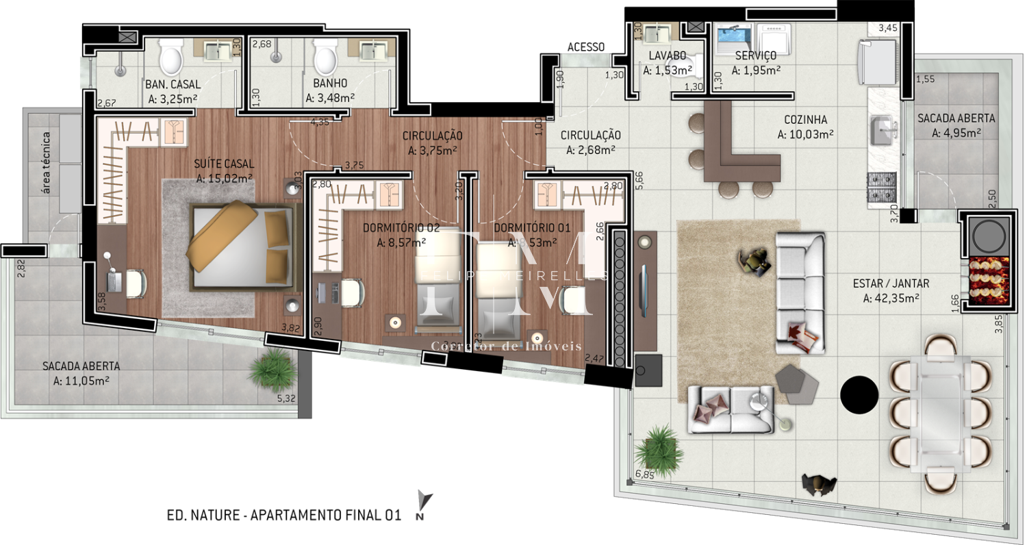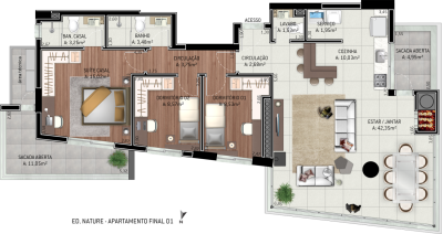 - 03 dormitórios, sendo um deles uma linda suíte com sacada aberta.