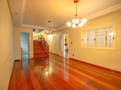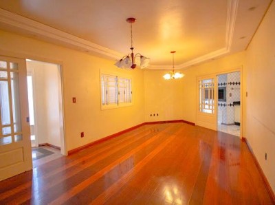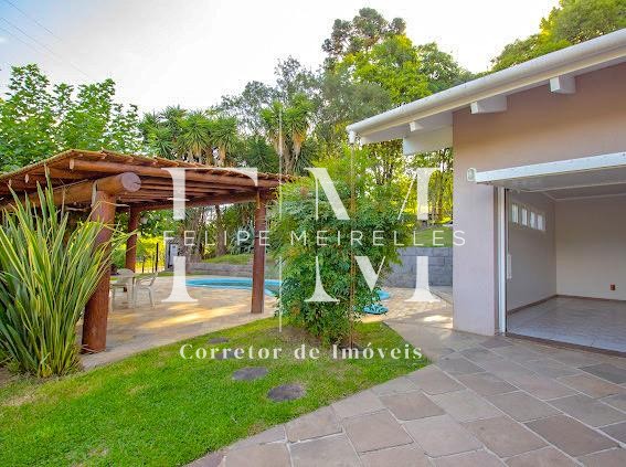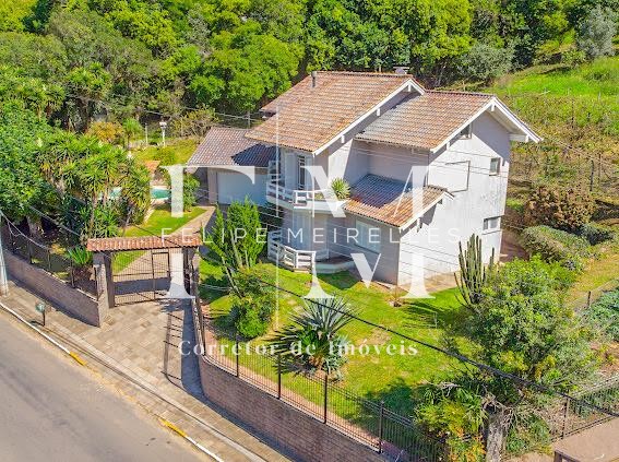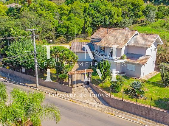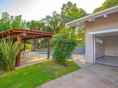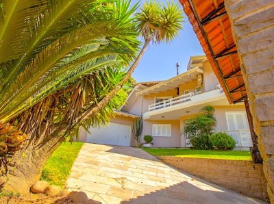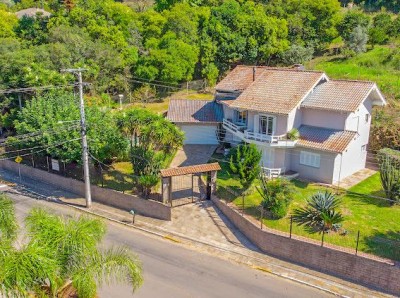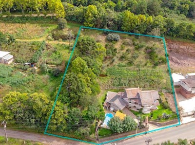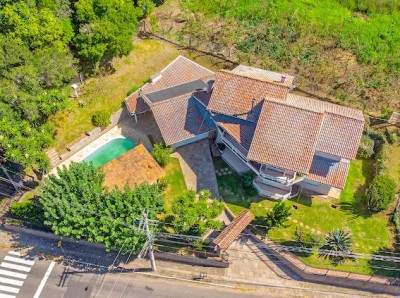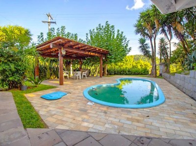 Descrição › Vendo casa 3 dormitórios (1) suíte 320 m2 com área verde frutíferas, piscina sisitema de aquecimento, quiosque, paisagismo e calçadas entorno, frente murada em pedra de basalto e cerca.
